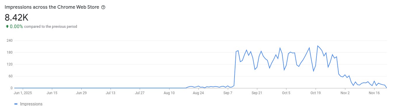 I also successfully applied for the ‘Featured’ badge on the Chrome Store, which brought a lot of new impressions but not many page views or installs.