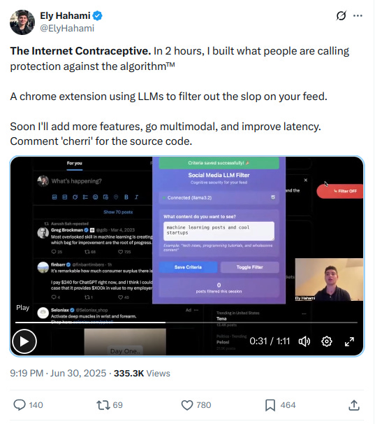 The extension implements a simple idea: filter content on social media, such as YouTube or X, based on user criteria in natural language, using an LLM.